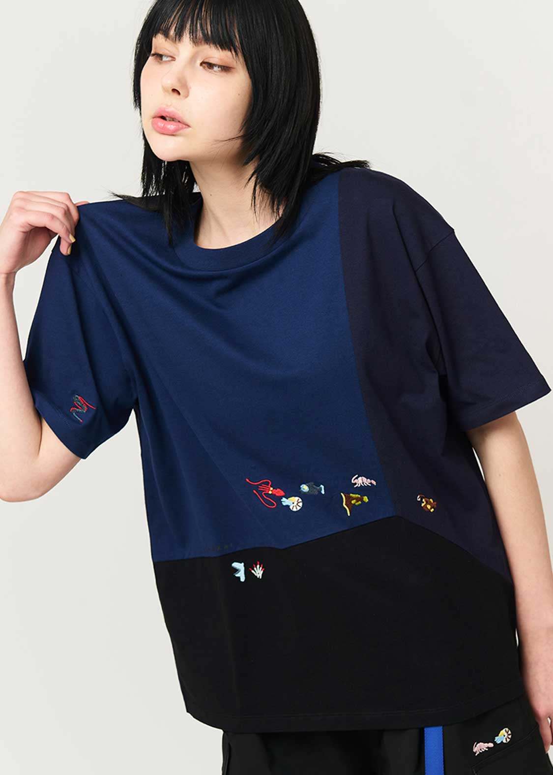 - A large silhouette T-shirt made of jersey with a rough texture.