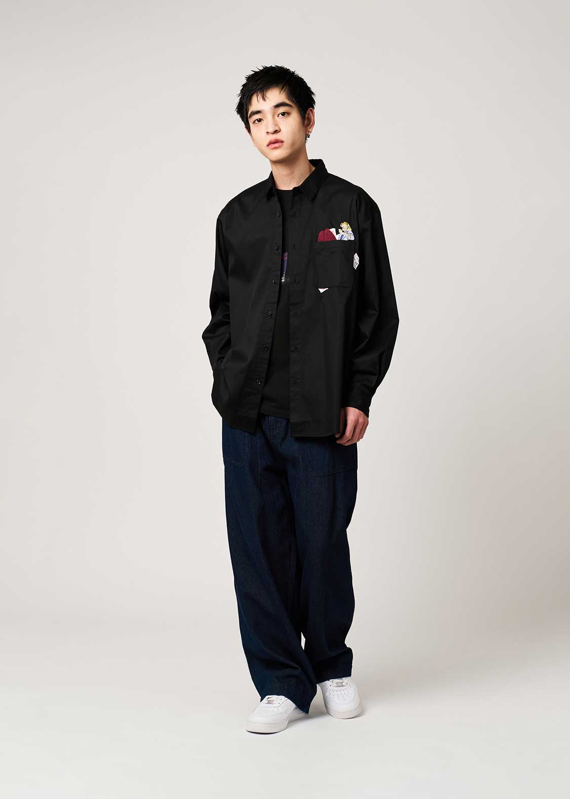 - A shirt with a relaxed silhouette. - An easy-to-coordinate item to wear as a jacket. - Two buttons on the cuffs ensure a snug fit even when worn oversized. - Embroidered