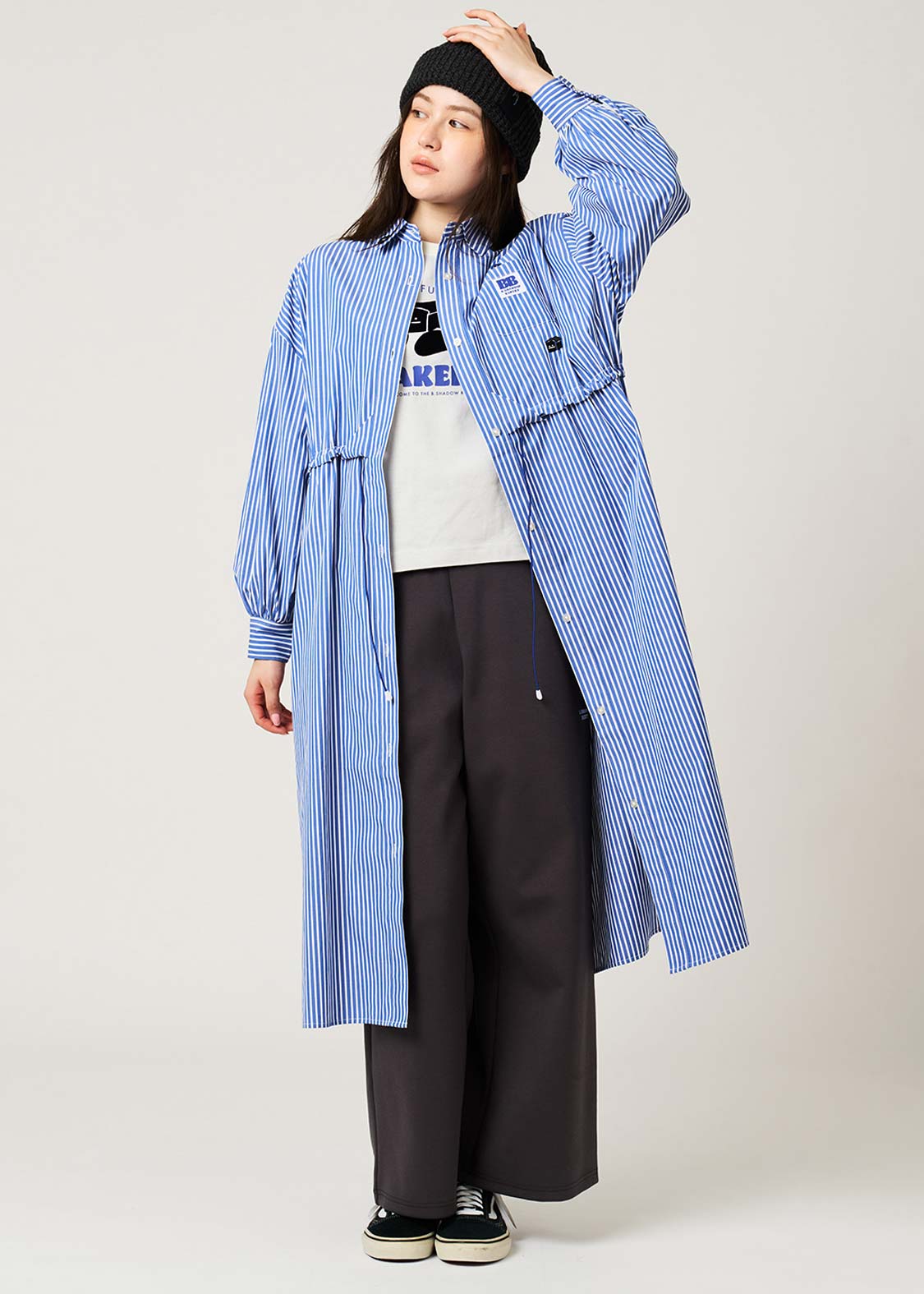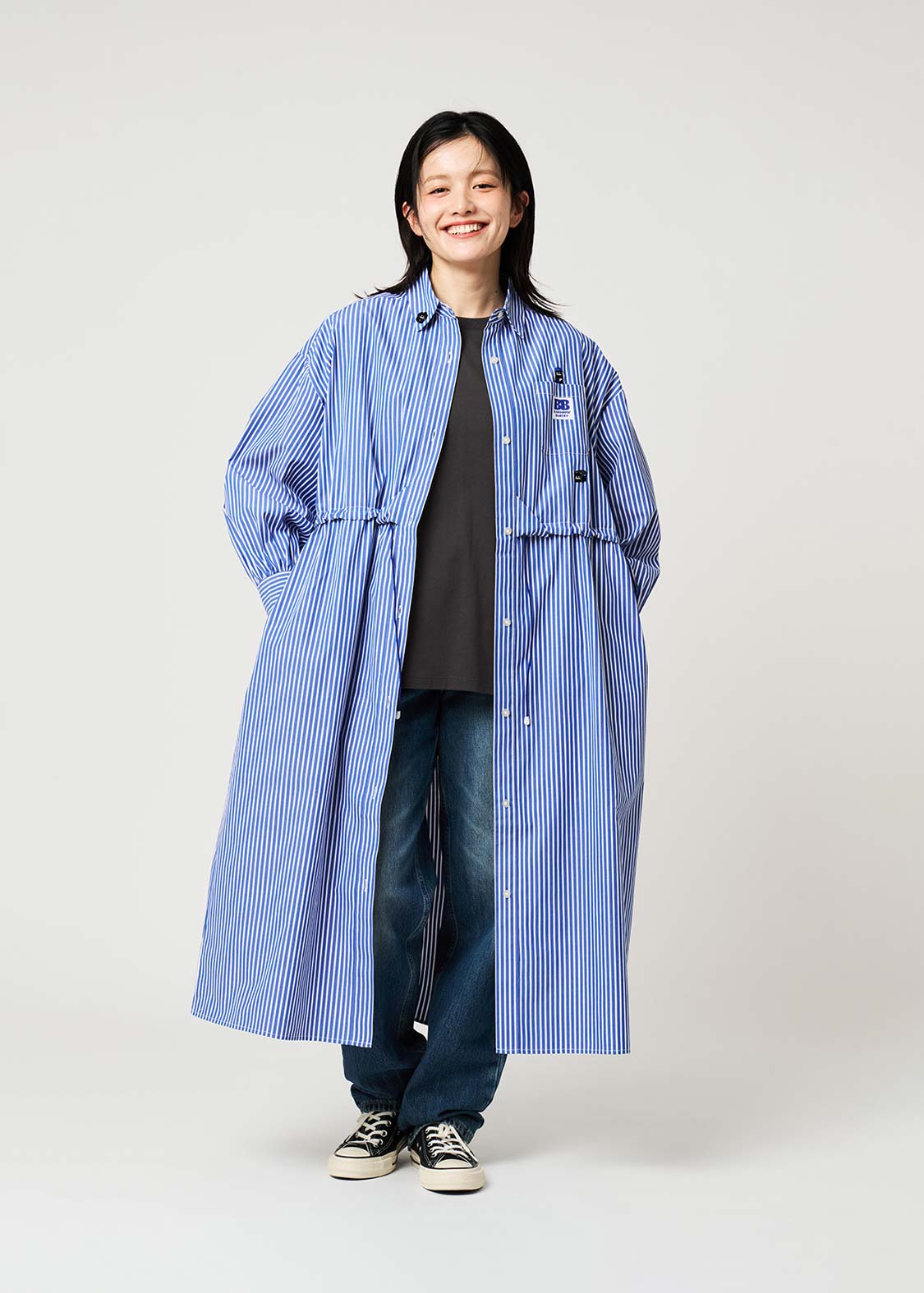 - A yarn-dyed striped shirt dress with voluminous sleeves. - Midi length, easy to wear on its own or as a jacket. - The waist can be tightened with a drawstring to adjust the silhouette. - Embroidered