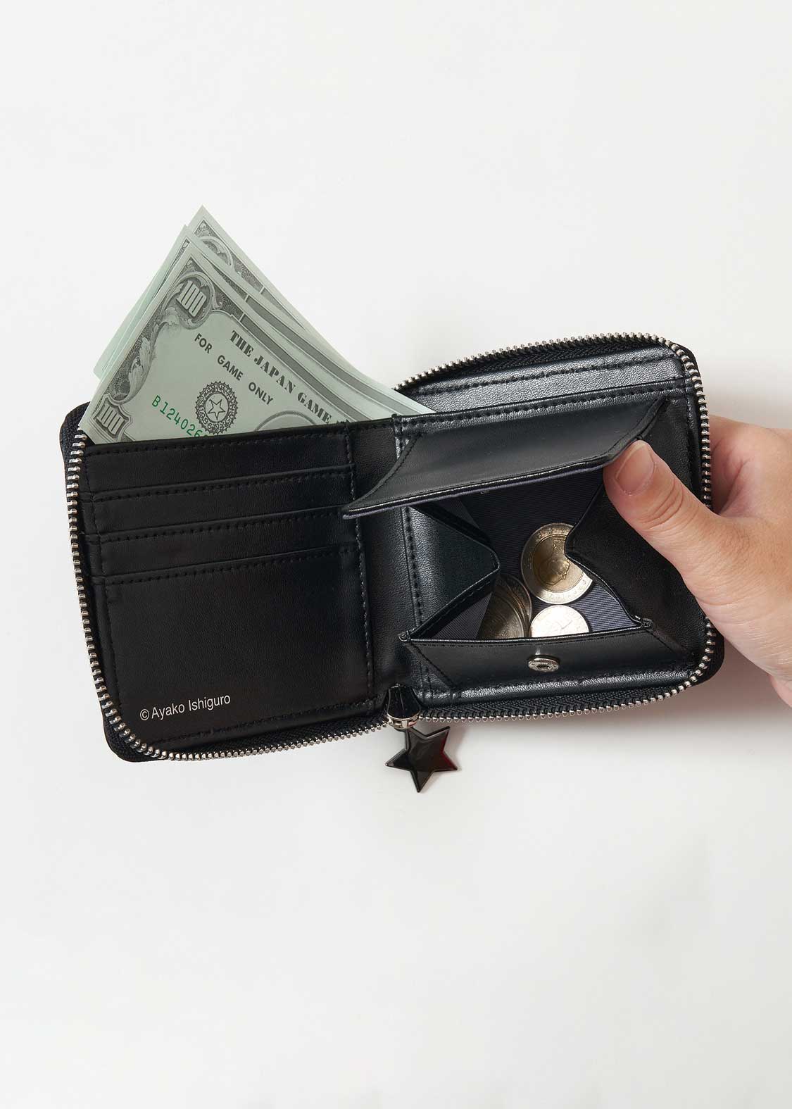 - A bifold wallet with a round zipper.